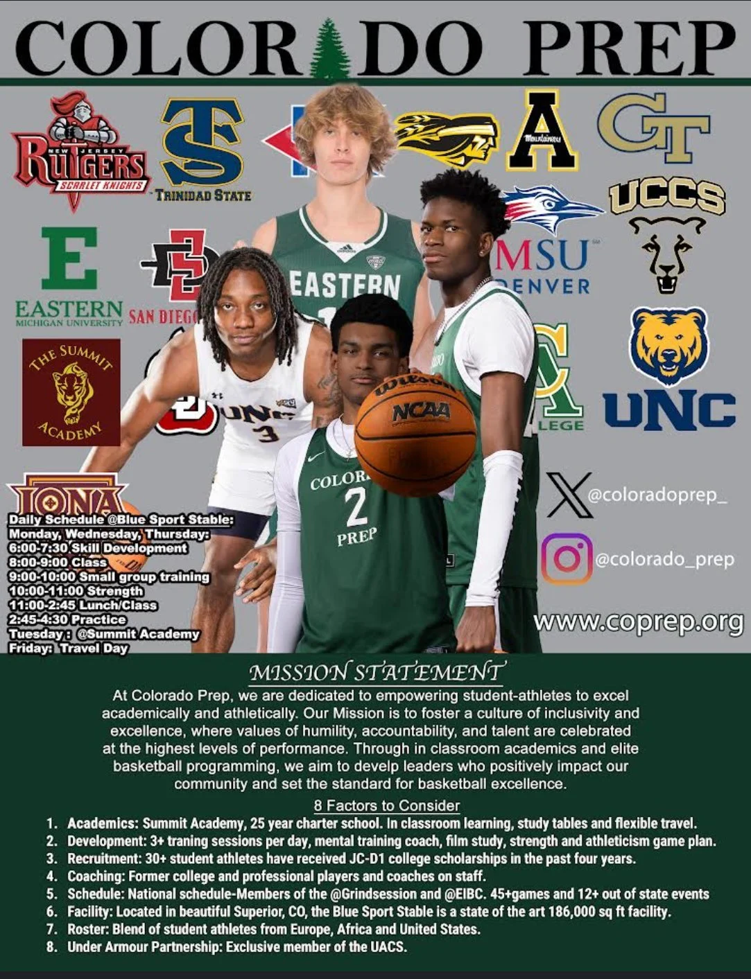 Colorado Prep is the first education-based and athletic-based preparatory school in the state, designed to give students an advantage both academically and athletically as they pursue their diploma and prepare for college. In addition to NCAA core courses, Colorado Prep will offer a unique curriculum geared towards athletically gifted students who desire to pursue collegiate and professional level sports as part of their post-secondary path. This curriculum is designed to propel these students into high level competitive sports with a strong foundation to find long term success in athletics as a career, as well as sustained success in their academic pursuits, personal well being, and leadership skills.